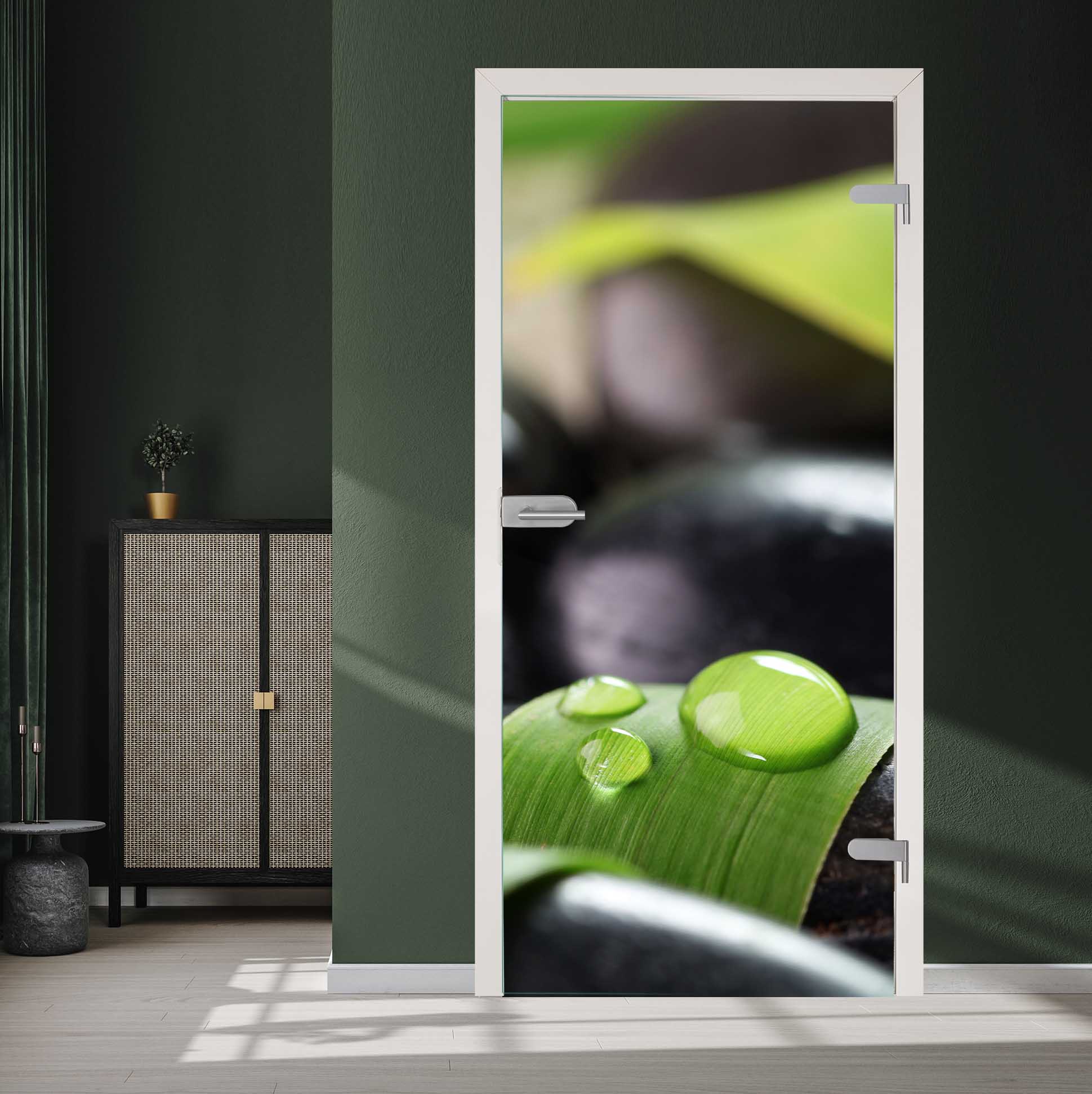 Anders wie bei anderen Anbietern, verwenden wir keine Folie, die zwischen zwei Glasscheiben montiert wird, sondern drucken direkt auf das Glas! Hierbei kommt ein ultraschneller UV-Flachbettdrucker zum Einsatz. Das Motiv "Balance" zeigt als Motiv Steine mit Gras und Wassertropfen.
