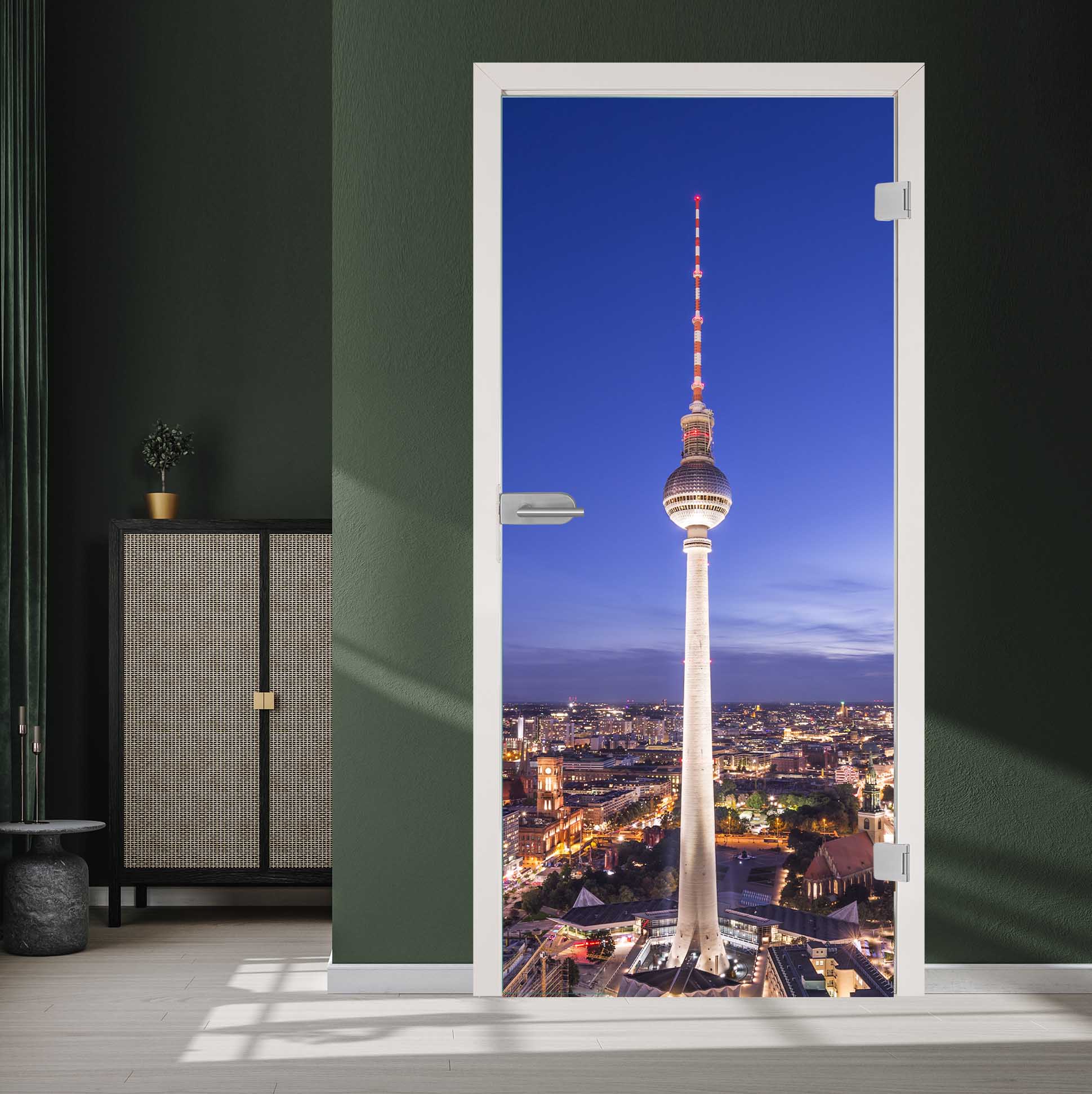 Anders wie bei anderen Anbietern, verwenden wir keine Folie, die zwischen zwei Glasscheiben montiert wird, sondern drucken direkt auf das Glas! Hierbei kommt ein ultraschneller UV-Flachbettdrucker zum Einsatz. Das Motiv "Berlin" bildet den Berliner Fernsehturm am Abend ab.