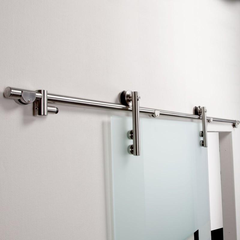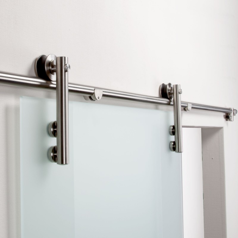 Die zwei Rollwagen mit flächenbündiger Glasbefestigung (Tragkraft: 100kg) sorgen dafür, dass die 8mm starke Scheibe aus Sicherheitsglas (ESG) sicher getragen wird. Die Bodenführung sorgt für eine stabile und sichere Führung der Glastür.