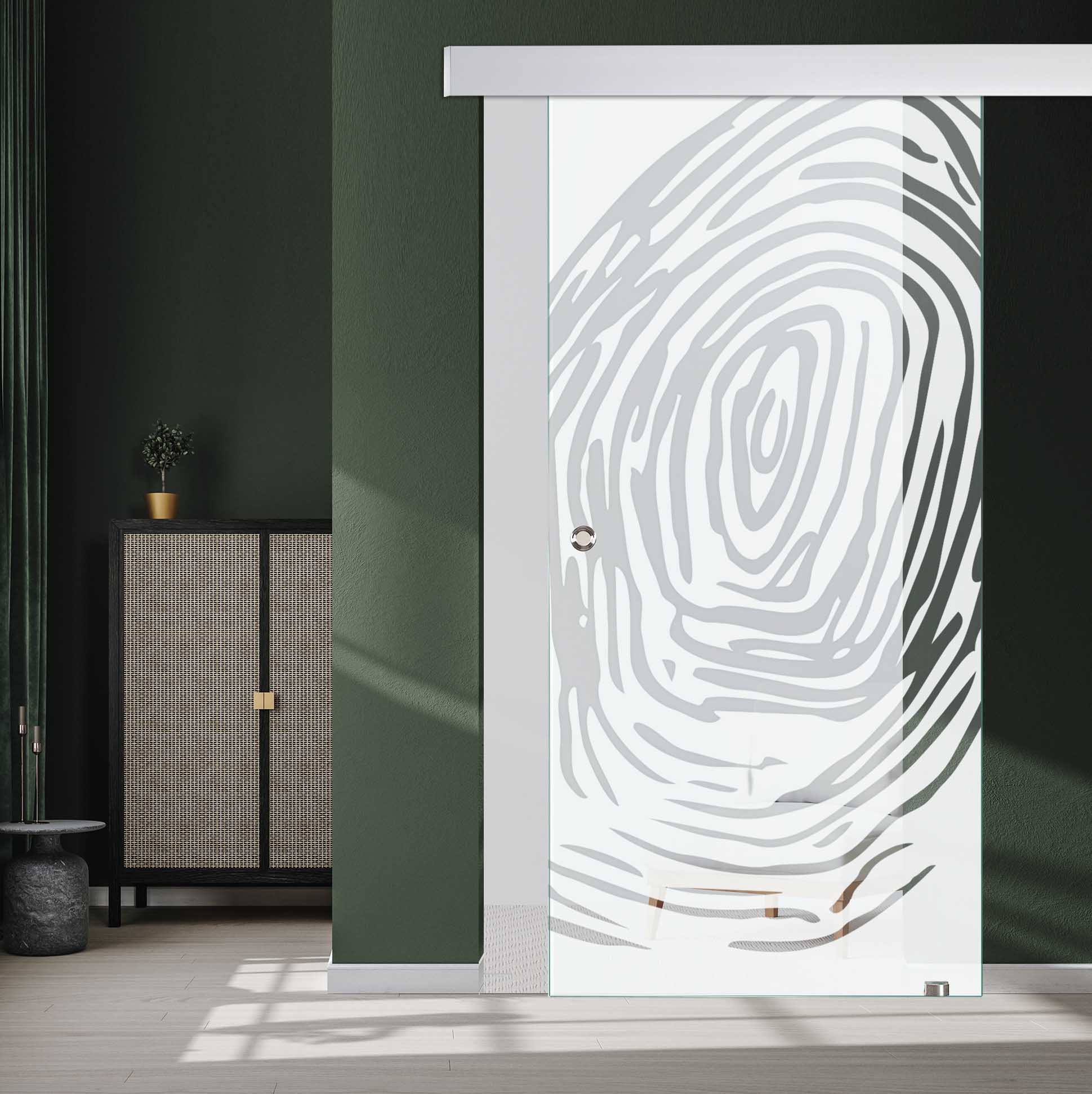 "Fingerprint", die Schiebetür aus Glas überzeugt durch das auffällige Dekor in Form eines Fingerabdruckes.