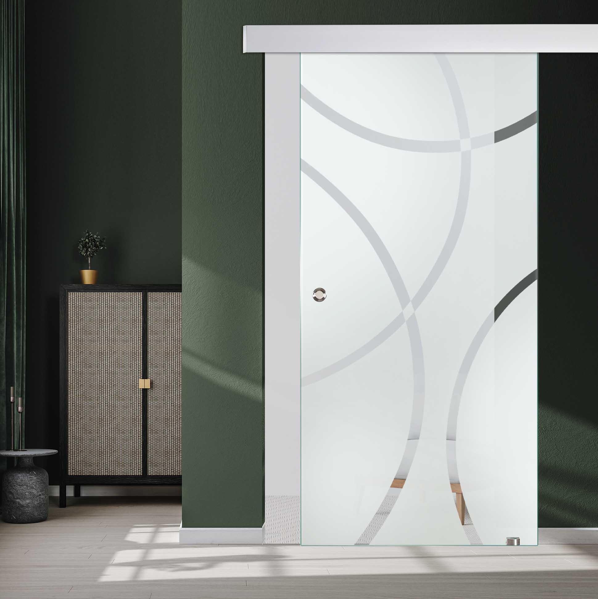 "Kurven", die Schiebetür aus Glas fällt besonders durch ihr interessantes Dekor auf. Durch ihre fast vollständige Mattierung lässt sie nur wenige Blicke in den dahinter liegenden Raum!